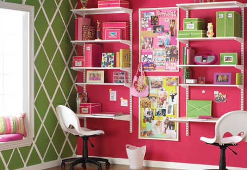 Estante de livros: adaptando uma estante para ser usada como escrivaninha. Ideal para irmãos que não conseguem ficar lado a lado estudando. Gostei muito também dos cestos pendurados, cheios de charme!