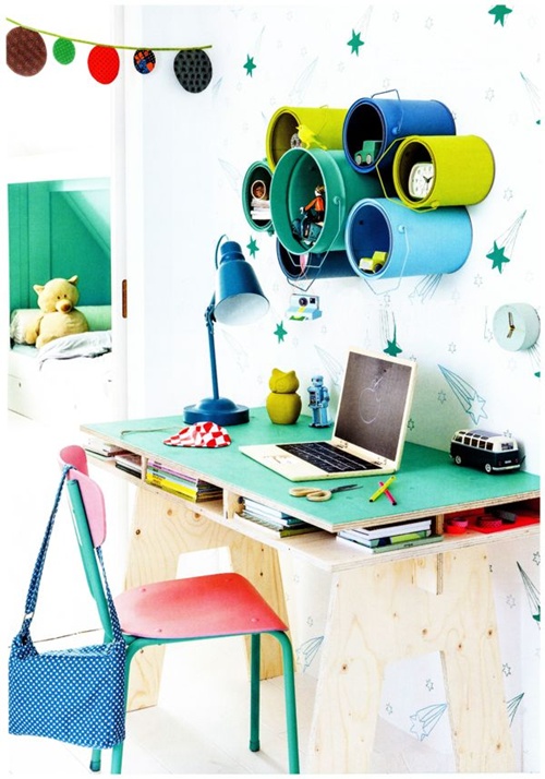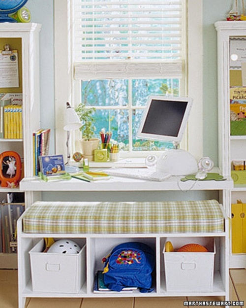 Para poupar espaço: um tampo de madeira entre duas estantes, e um banco com lugar para cestos. Essa ideia é para aproveitar cada centímetro do quarto!