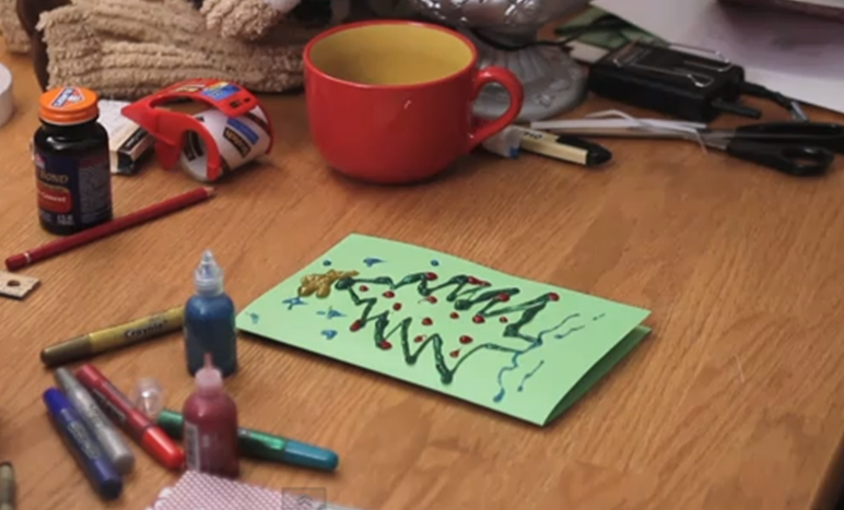 – Deixe secar por alguns minutos e depois, com um lápis vermelho (que na verdade pode ser de outra cor, mas o vermelho dá o contraste necessário e tem tudo a ver com o Natal) peça que o filhote escreva sua mensagem na parte interna.