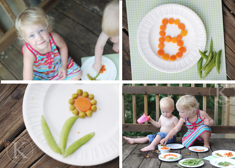 Cenouras e ervilhas podem ser usadas na confecção de lindas flores! Deixe seu filho fazer a composição!