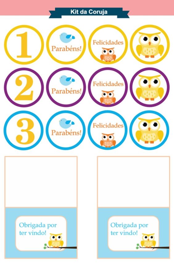 Nesse kit de festa coruja você encontra bandeirolas, bandeirinhas, wrappers para cupcakes, tags para doces e cartões de agradecimento e de identificação. Para fazer o download de cada um deles, é só clicar a seguir:
