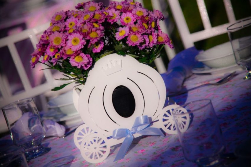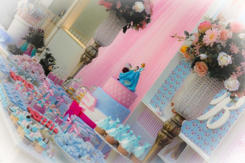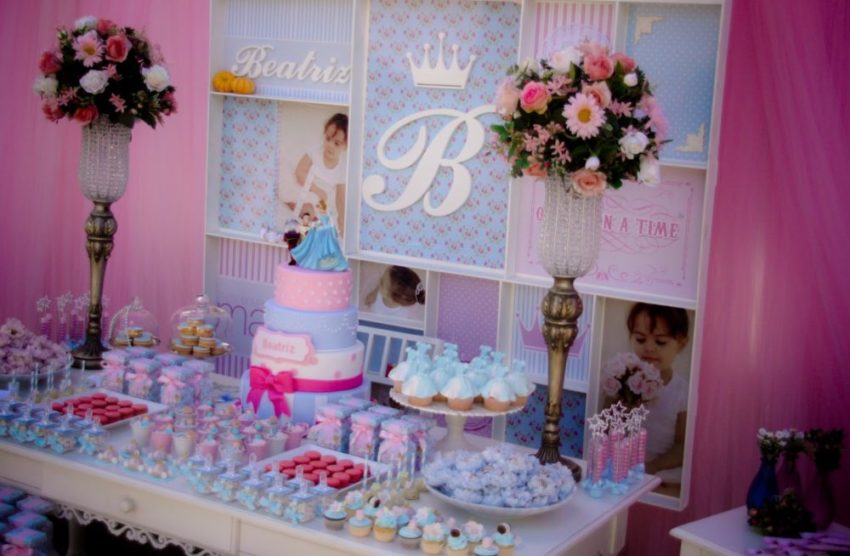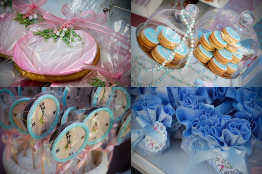 Vocês não podem imaginar como foi difícil encontrar uma festa da Cinderela para mostrar a vocês. Eu queria algo que remetesse à doçura da personagem, ao azul que é sua marca registrada, ao encantamento dos contos-de-fada. Demorou, mas encontrei! Repleta de detalhes, como biscoitos de abóbora, outros no formato do relógio, cupcakes com o vestido da princesa ou com linhas e botões (uma referência aos ratinhos que costuram o vestido de Cinderela para que ela possa ir ao baile)… E até mesmo uma carruagem, para a aniversariante e os convidados brincarem (e outra pequenina, cheia de amêndoas, para levarem para casa).