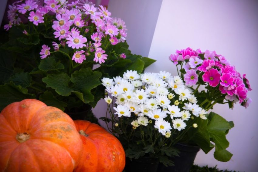 Flores e abóboras na decoração.
