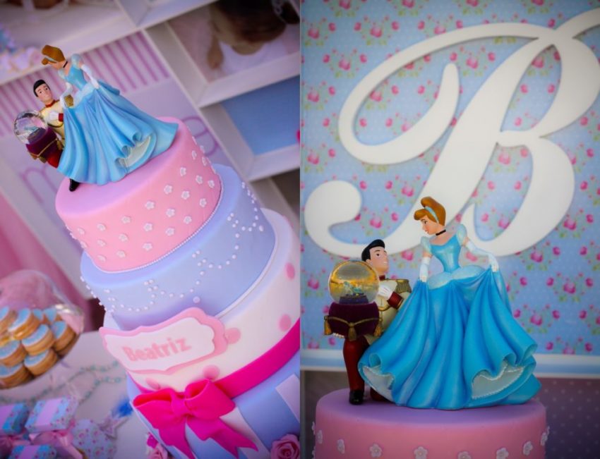 O maravilhoso bolo de aniversário da Cinderela em camadas! No detalhe, ela e o príncipe.