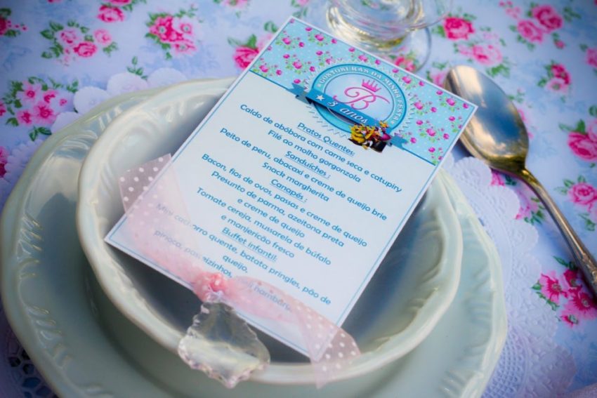 O menu da festa (com o floral combinando, aliás, com a toalha de mesa!)