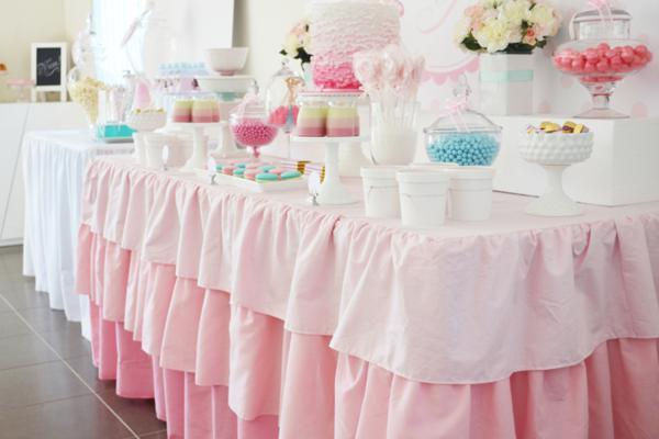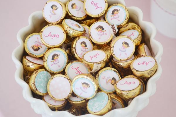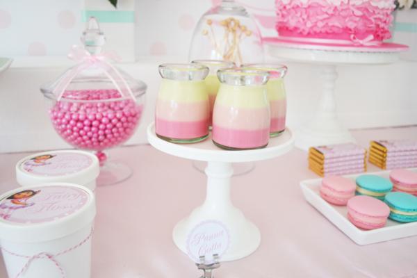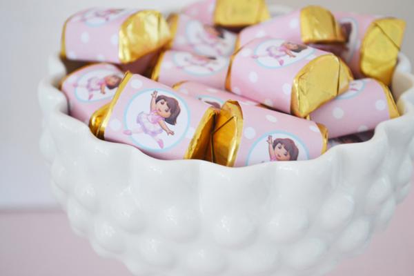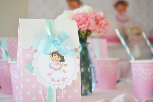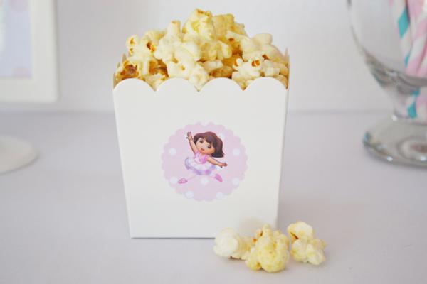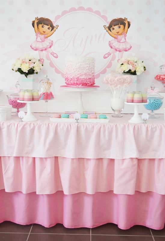 De uns tempos para cá, Catarina começou a ficar fascinada pelo desenho da personagem Dora, a Aventureira. Pede para assisti-lo umas quinhentas vezes ao dia e não pode ver uma revistinha com a figura da Dora, que insiste alucinadamente em levar. Talvez, se ela pudesse escolher um tema de aniversário hoje, escolheria a menininha e sua turma. Por isso, quando vi essa festa da Dora bailarina, não pude deixar de compartilhar com vocês. Diferente da animação, que se caracteriza por ser bastante colorida, a decoração que mostro é fundamentalmente rosa, com alguns toques de azul turquesa (nos macarrons, lacinhos, canudinhos). O bolo, imitando os tutus de uma bailarina, ficou muito, muito fofo. Ah, e combina com a toalha da mesa, que apresenta o mesmo detalhe de várias camadas em tons degradê de cor-de-rosa. Se você reparar bem, a personagem aparece apenas em impressões (no pôster ao fundo, nas tags das lembrancinhas e docinhos, no rótulo das garrafinhas de água, na caixinha de pipoca), o que deixou a decoração clean, sem exageros. Vamos conferir as fotos?