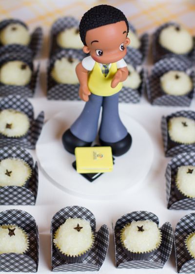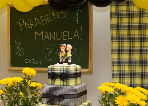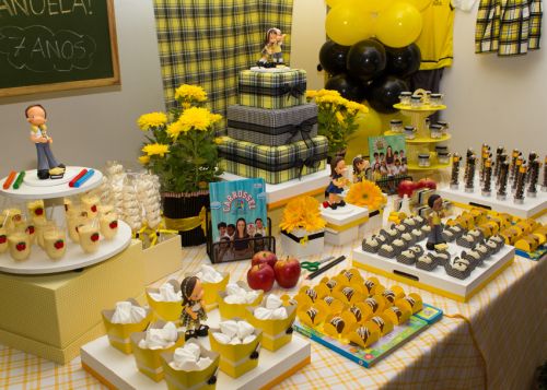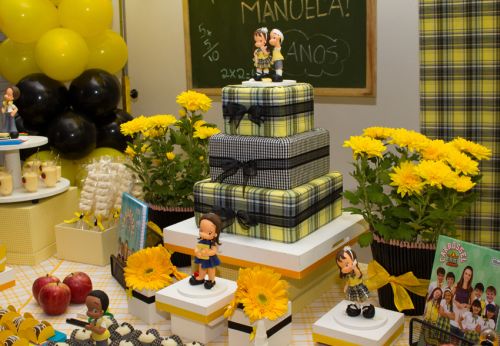 A festa da pequena Manuela foi feita toda em amarelo, branco e preto, com bonequinhos inspirados nos personagens da novela.