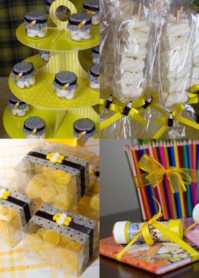 Mais docinhos: em potinhos, caixinhas, espetinhos de marshmallows e as lembrancinhas, com caderninho e bolhas de sabão dos personagens.