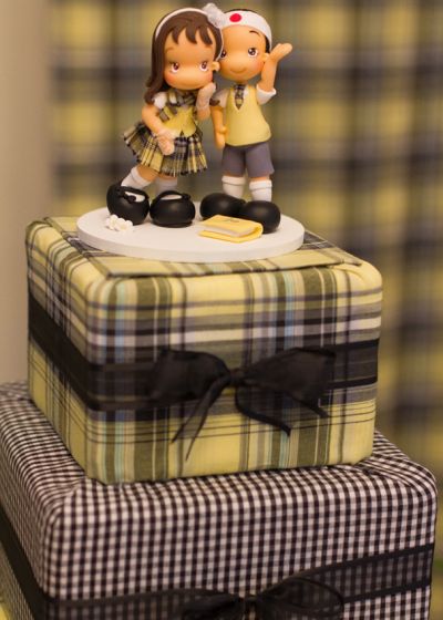 Ao invés de um bolo convencional de vários andares, optou-se por uma torre de caixas encapadas com tecido. Adorei!