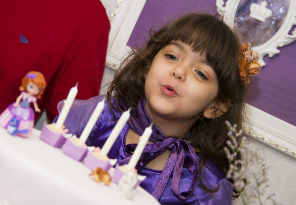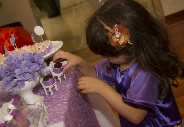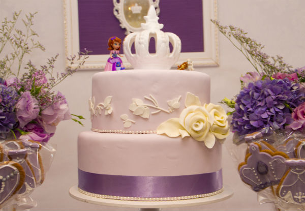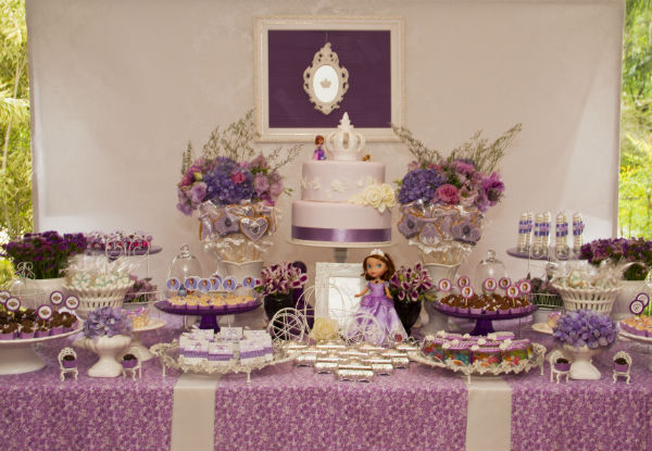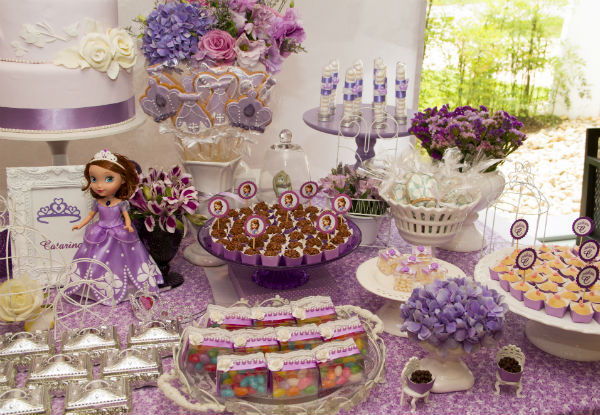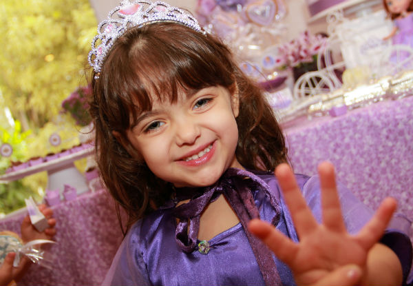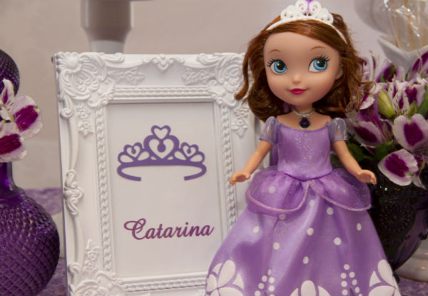 Acho que já contei para vocês, mas se não contei, falo dessa vez: temos uma brincadeira aqui em casa – a de que Catarina é a própria Sofia. Fisicamente, eu acho a pequena parecida com a personagem da televisão, mas as semelhanças não param aí. Cacá, como a chamo carinhosamente, é espirituosa e alegre como a princesinha do desenho! E foi ela mesma quem escolheu uma festa da Princesa Sofia para comemorar seus 4 anos (não é que por aqui escapamos de Frozen? Mas os 5 anos prometem uma decoração “congelante” em azul e branco!).
