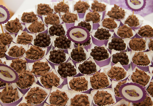 Os docinhos são de uma amiga querida (que também fez biscoitos com o mesmo detalhe que a Princesinha Sofia tem em seu vestido!), a Renata Herrera, da Happy Cakes. Simplesmente deliciosos, e em um ponto que eu jamais alcançaria em casa! Escolhi brigadeiros com dois tipos de cobertura, beijinhos e o docinho de chocolate branco (divino!). Recomendo muito, porque é tudo feito com capricho e por um valor super justo.