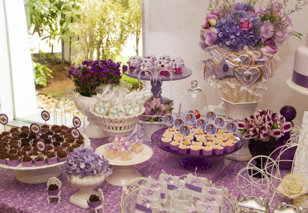 A decoração (que ficou tão linda, a ponto de me emocionar) foi feita pela Malu Mattos. Eu só enviei fotos do salão de festas, e no dia ela chegou com tudo absolutamente pronto e perfeito! O painel com o quadro para emoldurar a mesa de doces, os arranjos florais em lilás e rosa, a boneca da Princesa Sofia, o bolo cenográfico e todas as guloseimas em potinhos e caixinhas (a prateada tinha bala de coco, um arraso!) são obra dela.