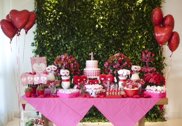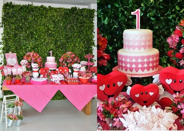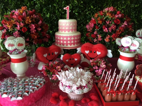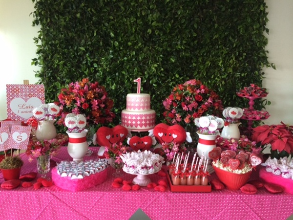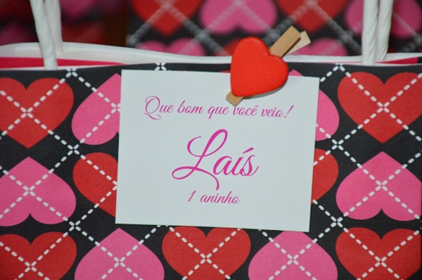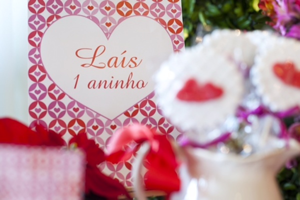 Fiquei encantada com essa festa de corações para comemorar o primeiro aniversário da pequena Laís. Um tema muito original, que eu nunca havia visto na decoração de uma festa infantil. E, pensando bem, não é perfeito? Mostra quanto amor um bebê que chega em nossas vidas pode inspirar!