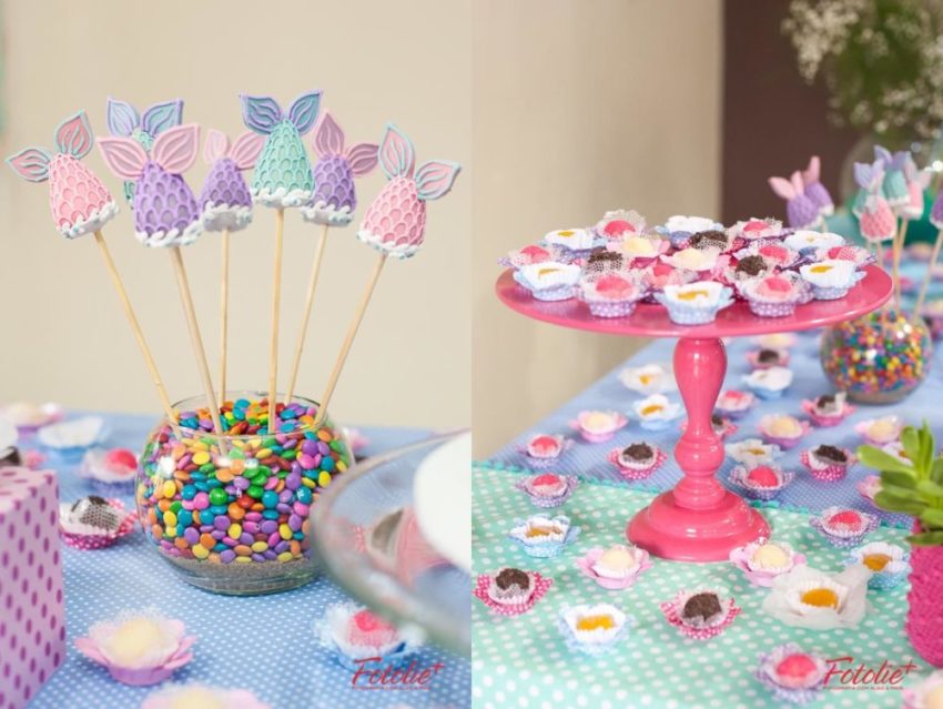 Os doces: palitos com a forma de cauda de sereia e um suporte para dar charme aos doces tradicionais!