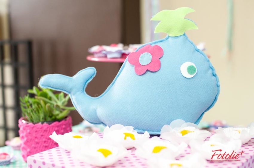 Bolinhas na toalha de mesa, na caixa que sustenta a baleia e nos cachepôs para os vasinhos de flores.
