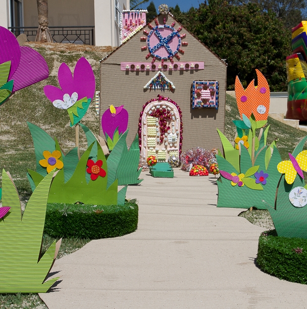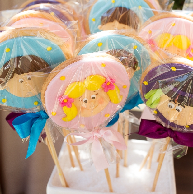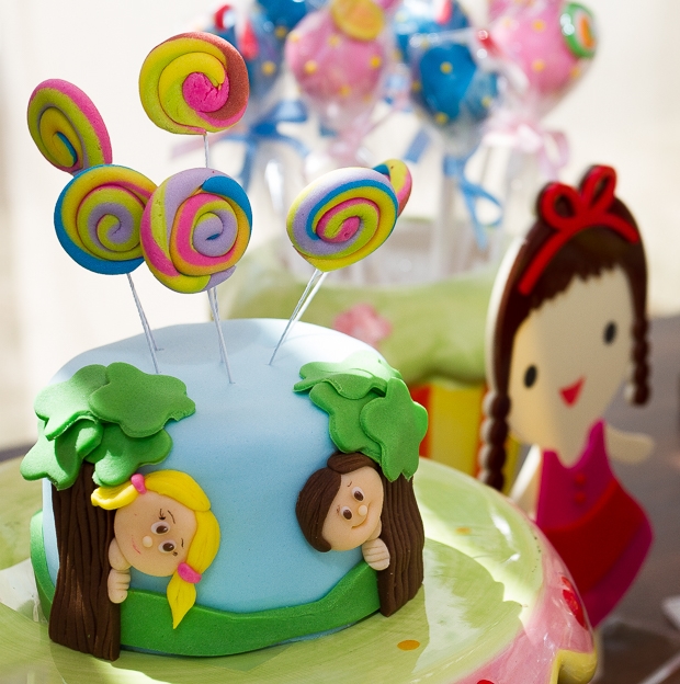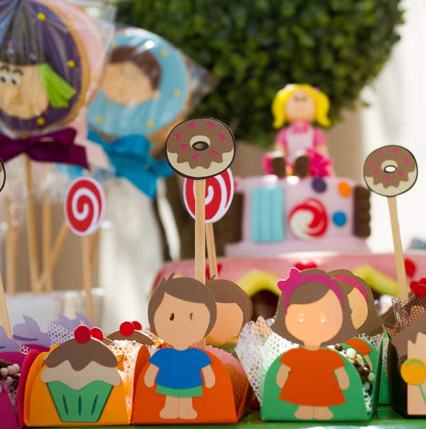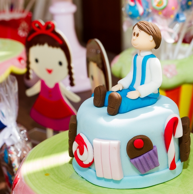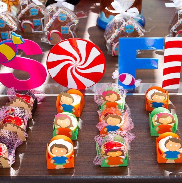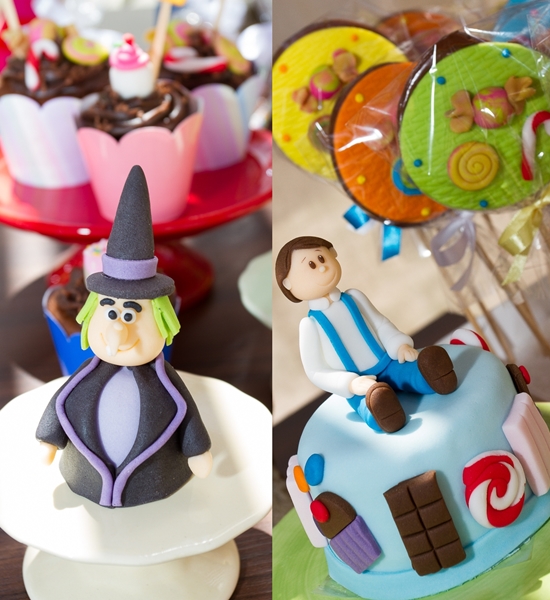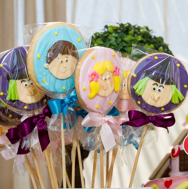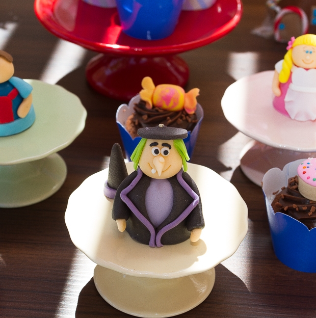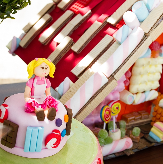 Adorei o cenário com a casinha de doces montada logo na entrada da festa. Com certeza as crianças se divertiram muito, passeando entre flores gigantes. A mesa de doces foi toda montada com detalhes que remetiam à história do livro: os dois irmãos e a bruxa estavam no bolo, nos cupcakes, nos biscoitos decorados… Embora não seja dos meus contos favoritos (eu sempre me perguntei onde estavam os pais dessas crianças, que deixaram que os filhos andassem sozinhos pela floresta!), acredito que a decoração esteja cheia de inspirações para as mães de filhotes que gostam do tema!