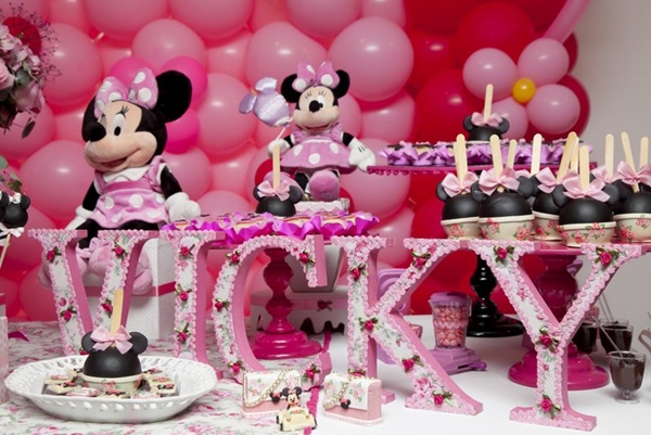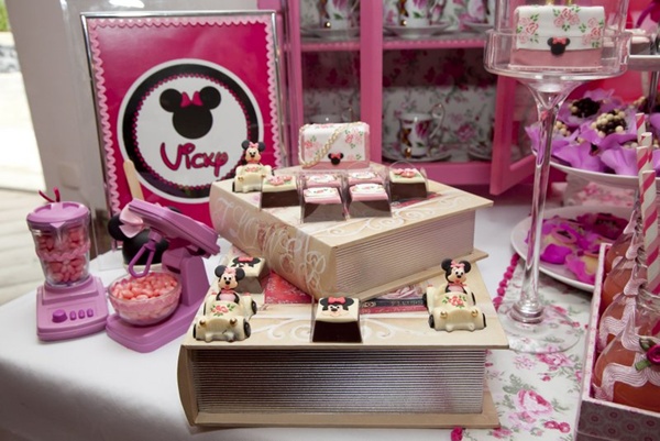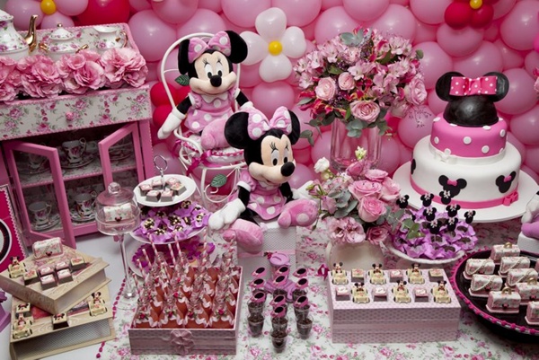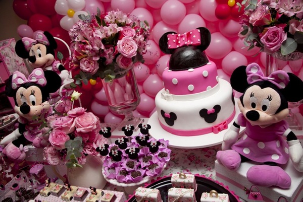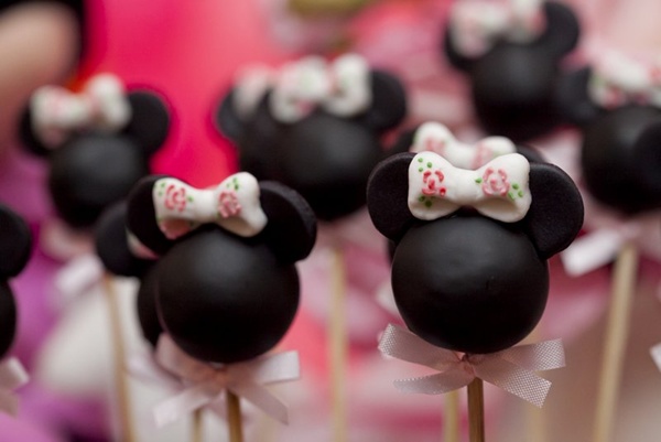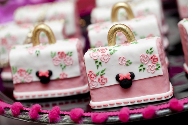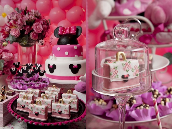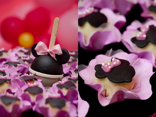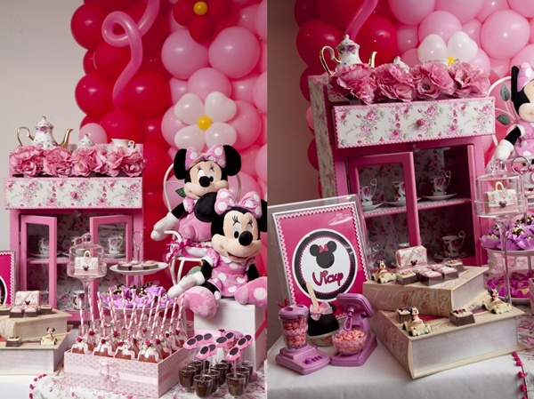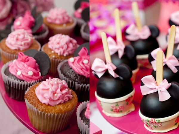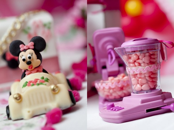 Vocês podem então imaginar a minha reação ao receber essa festa Minnie da Miss Sugar, com cor-de-rosa por todos os lados: nos arranjos florais, no painel de balões atrás da mesa, nas forminhas de doces, toalhas e até na louça de porcelana. Certamente, uma das produções mais bonitas que já vi sobre o tema (por isso, claro que eu precisava compartilhar com vocês!).