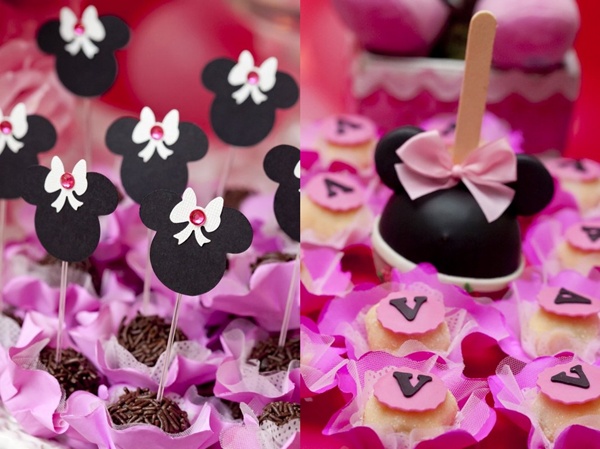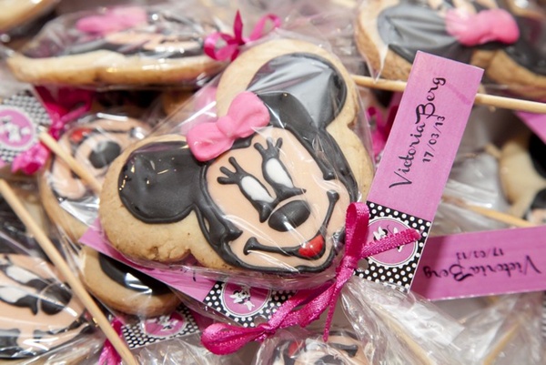Eu adorei os doces, biscoitos, maçãs do amor e o bolo com orelhinhas; assim como as bolsinhas delicadas aplicadas nas colheres dos copinhos de brigadeiro. E por fim as várias Minnies que davam as boas-vindas a todos os convidados da pequena Vicky.