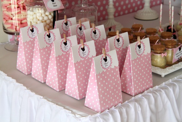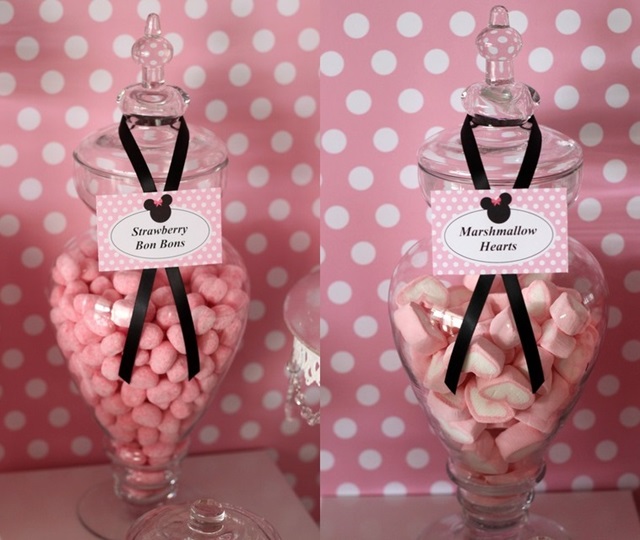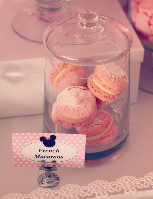 Doces: vidros com bombons de morango e marshmallows em formato de coração ajudam a compor a decoração – e são uma delícia! Aposte também em cupcakes, cakepops, biscoitos com orelhinhas… Os macarons também estão na moda para as festas infantis, e deixam qualquer mesa de doces requintada – aposte neles na sua festa Minnie rosa.