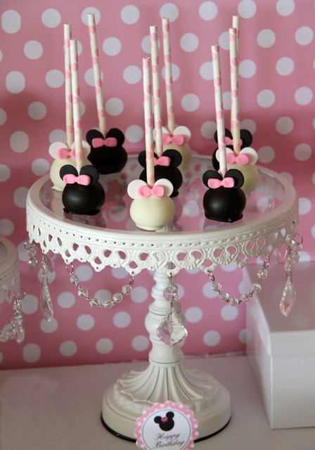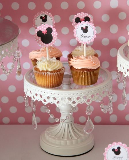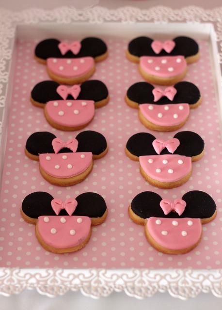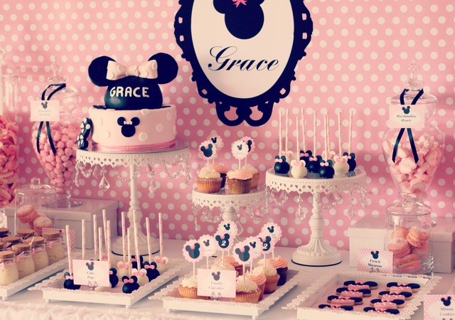 Bolo: ele pode ter uma camadas ou várias, ter uma Minnie no topo ou simplesmente orelhinhas. Eu adoro a versão com camadas de glacê fazendo um “frufru”, como em uma das fotos abaixo.