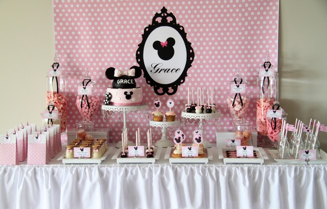 Decoração: adoro a ideia de colocar um painel atrás da mesa de doces. E achei esse a seguir, com a moldura e nome da menina, uma graça! Outra dica: repare que apenas com bandejas, pedestais de diferentes tamanhos e alguns potes de vidro, preenchidos com doces no tema, é possível produzir uma festa Minnie rosa incrível!