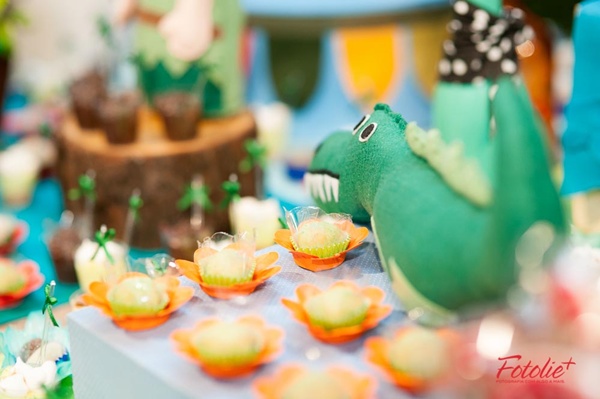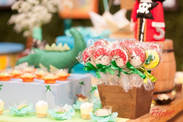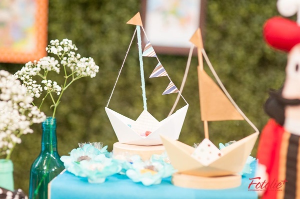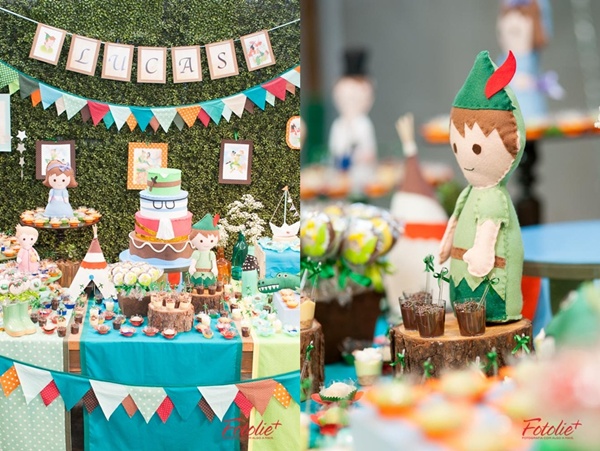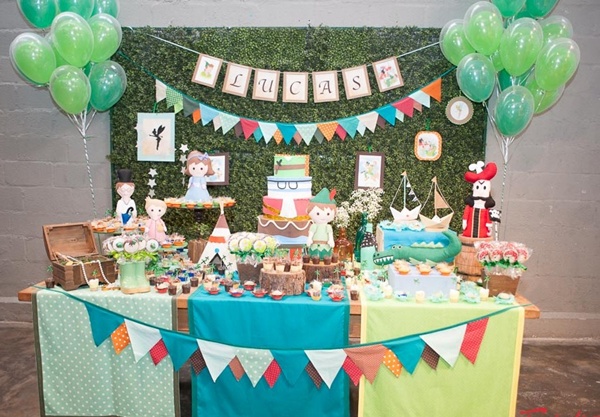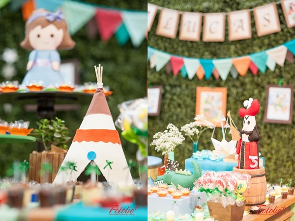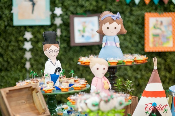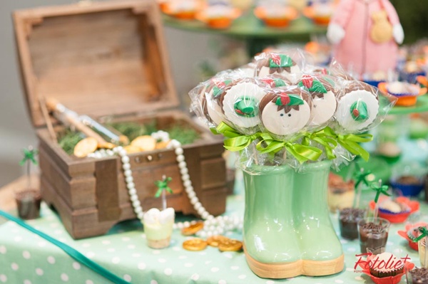 O verde e o azul foram as cores predominantes dessa festa Peter Pan. Os personagens ficaram uma graça: Peter Pan, Wendy, João, Miguel, Capitão Gancho e, é claro, o crocodilo! Adorei o efeito dos balões duplos com gás hélio, as faixas de tecido que deixaram parte da mesa de madeira à mostra, a botinha verde que serviu de cachepô para os palitos de biscoito, o baú do tesouro, a mini cabana indígena e os barquinhos de papel. Fofíssimos!