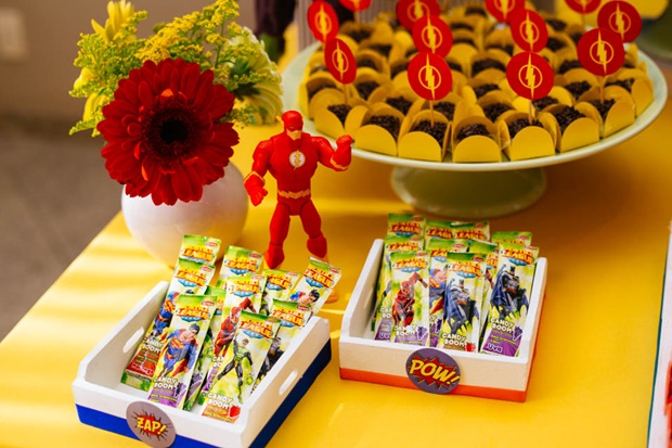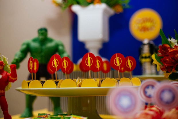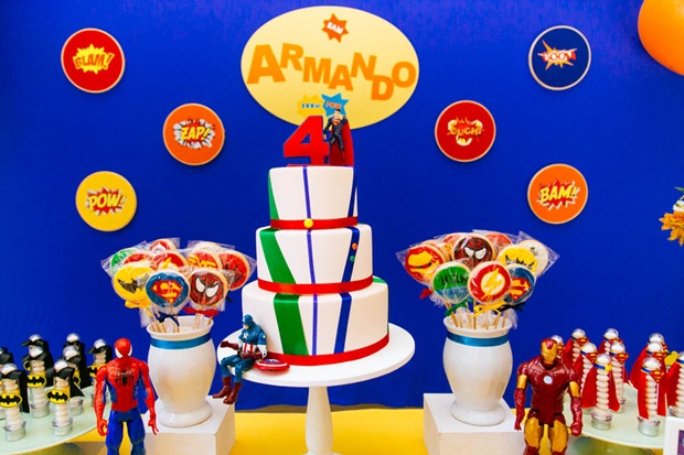 Coisas que eu achei interessantes nessa decoração: o painel azul com as bolas coloridas como pano de fundo para a mesa de doces, os biscoitos em palitos com os símbolos dos heróis e o uso dos bonequinhos para compor a mesa. E a forma como ela usou o bolo cenográfico, que também ficou muito bacana!
