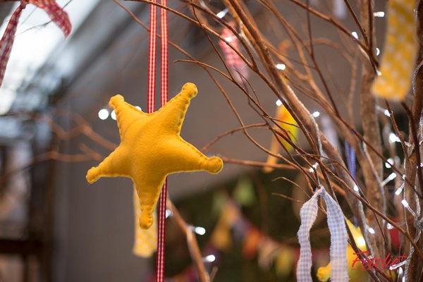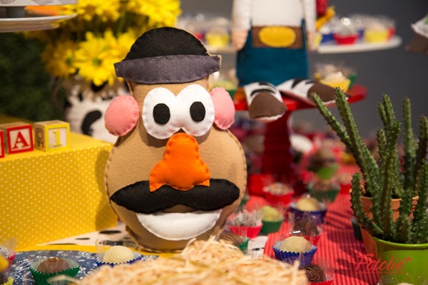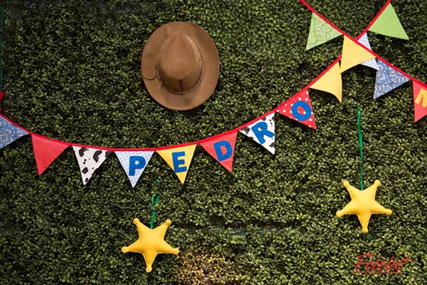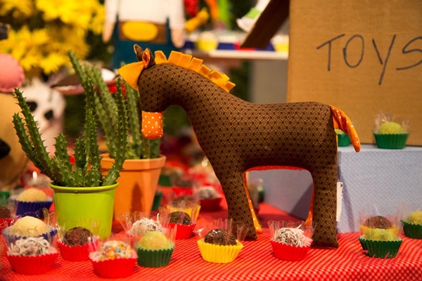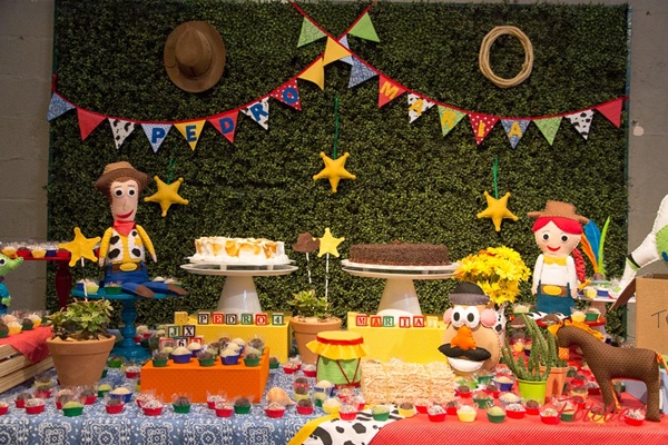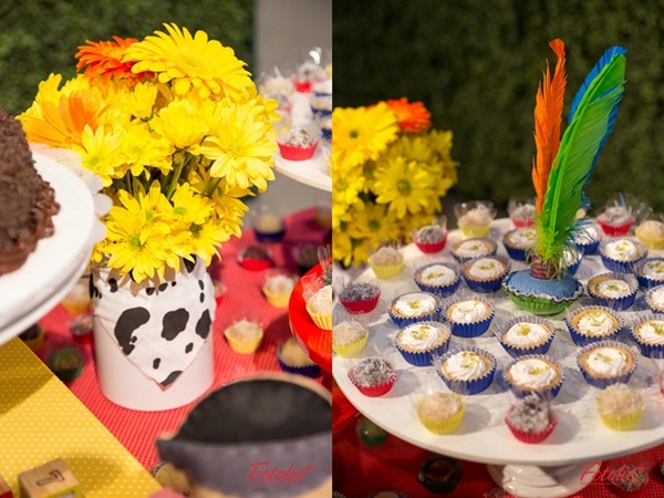 Além dos personagens, alguns detalhes que deixaram a festa bem bacana: o painel com vegetação atrás da mesa do bolo, os bloquinhos de madeira formando o nome dos aniversariantes (um menino – Pedro – e uma menina – Maria! Está vendo só como a festa é perfeita para ambos os sexos?), a estrelinha e o chapéu do Woody, e a corda da vaqueira Jessie. Tudo muito fofo e colorido, do jeito que criança gosta!