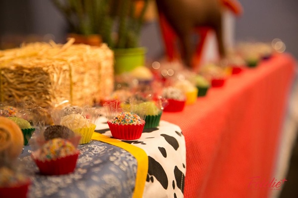 Interessante perceber também que forminhas de doces simples combinam muito bem com o contexto da decoração, assim como flores do campo. Amei a ideia de colocar tecido com estampa de vaquinha nas bandeirolas e compondo a mesa!