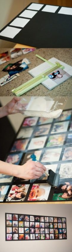Fazendo um mural bacana em casa: há uma técnica muito interessante para que você mesma construa seu mural de fotos. Basta usar um papel cartão de alta gramatura, recortar as fotos no formato desejado e colá-las, fazendo a composição. Em seguida, passe uma camada de cola “especial” sobre elas (em inglês chama-se “mod podge”, que nada mais é do que uma cola aguada. Para prepará-la, basta misturar uma parte de cola branca com uma parte de água). O efeito será um acabamento fosco em toda a superfície. Prontinho!