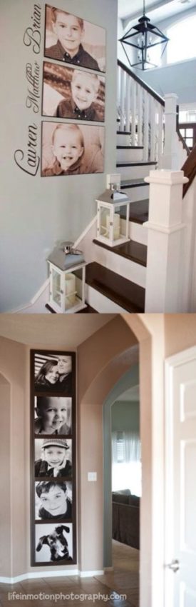 6 – Na vertical: adorei a ideia de colocar fotos na parede da escada com o nome de cada criança. Aquele cantinho apertado do corredor é outro ponto onde esse tipo de composição cai muito bem.