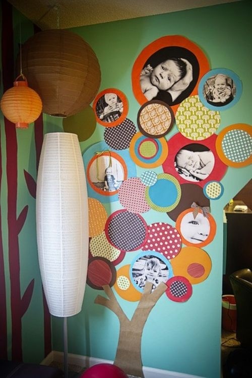 2 – Árvore moderna: genealógica ou não, a ideia aqui é usar papéis ou tecidos coloridos de diferentes padrões, para dar alegria à parede. Corte círculos de tamanhos distintos e siga seus instintos na hora de compô-los. Muito legal para dar destaque às fotos preferidas do seu filho!
