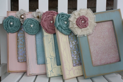 Porta-retratos: você pode comprar porta-retratos de madeira básicos e decorá-los com pedaços de tecido (fitinhas de tecido enroladas dão uma bonita flor). Para dar um visual mais elaborado, escolha papéis com estampas delicadas e coloque em seu interior, no local em que ficará a foto (veja abaixo como deixam o porta-retrato mais bonito!).