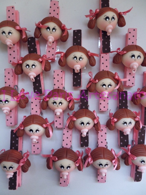 Prendedores: são super úteis para fechar pacotes, saquinhos, e com certeza suas convidadas usarão no dia-a-dia. Se não quiser ter muito trabalho, apenas pinte de uma cor básica e faça bolinhas com canetinha preta. Se tiver um pouco mais de habilidade, compre massinha de biscuit pronta (já vêm em várias cores – você pode encontrar em grandes papelarias, algumas que entregam pela internet) e faça bebezinhos, corações ou o que sua imaginação mandar!