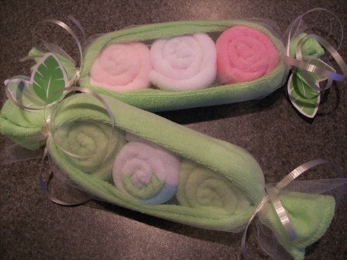 Toalhinhas: olha que graça – três toalhas de lavabo enroladas em uma quarta, como se fosse uma vagem com três ervilhas. Arremate envolvendo o conjunto em tule e amarrando com fitas (dá até para fazer o detalhe das folhas em papel!).