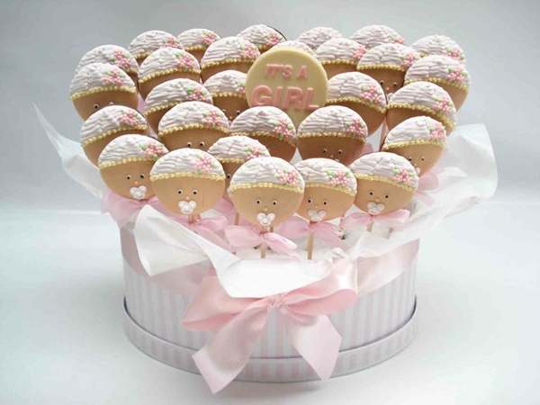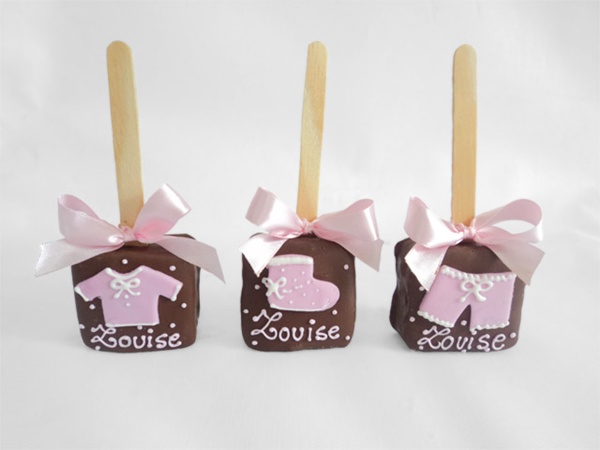 Pães de mel: adorei esses, no palito e decorados com roupinhas de bebê cor-de-rosa. Da Peppermint Place, são deliciosos!