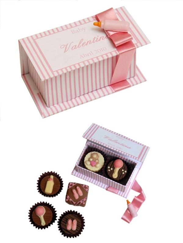 Chocolates: ainda está para nascer uma mulher que não goste de chocolate. Uma lembrancinha como essa, com bombons decorados com chocalhos, ursinhos e mamadeiras cor-de-rosa certamente fará sucesso. Da Petit Souvenir.