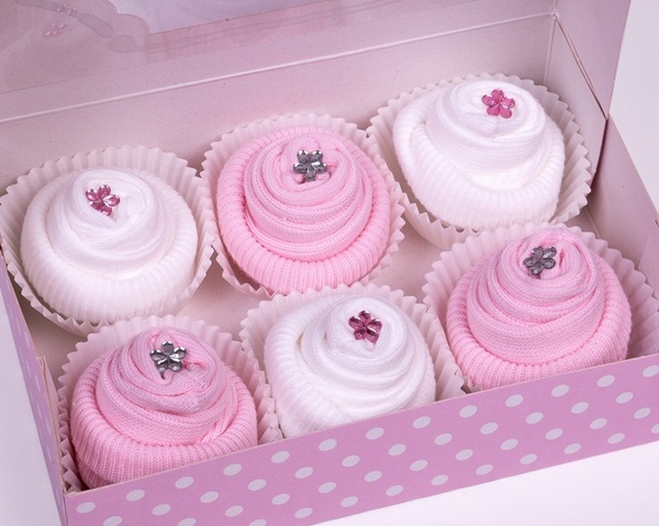 Meias: enroladas como cupcakes! Se você é do tipo que gosta de colocar a mão na massa, pode aprender a fazer aqui. Ficam lindas em forminhas e embaladas em uma caixinha para cada convidada.
