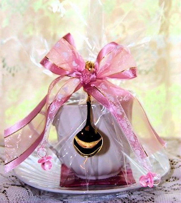 Xícara: embrulhada com um sachê de chá e uma colherzinha. Afinal, é um chá de bebê, não é mesmo? Arremate com uma fita cor-de-rosa!