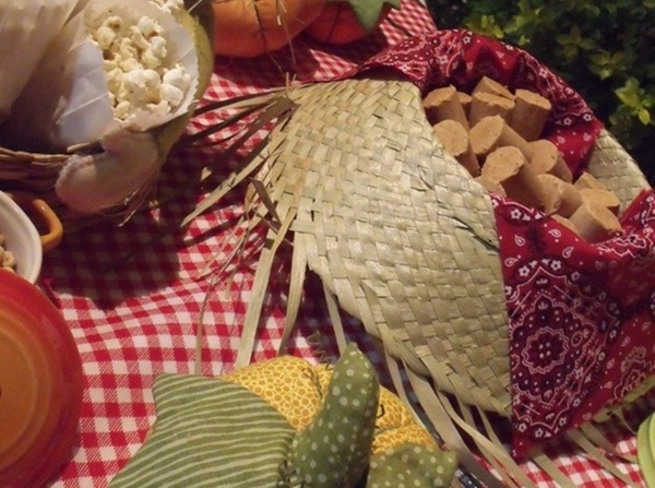 Chapéu de palha: forrado com um lenço, pode servir como um ótimo prato para os docinhos; como esse que leva as paçoquinhas.