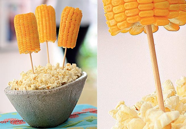Milho no espeto: ideia de fácil execução. Coloque a pipoca para fazer a composição!