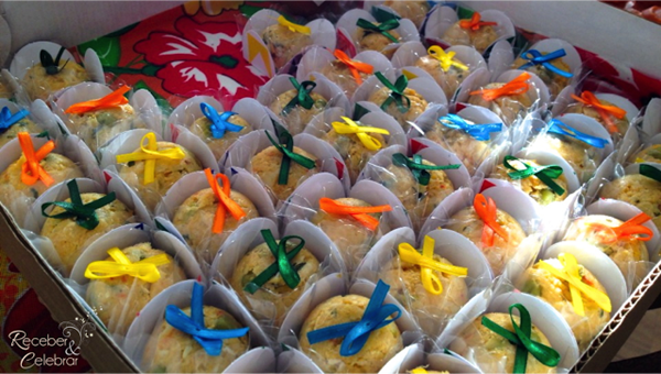 Mini cuscuz: enfeitar os mini cuscuz com fitinhas também vale. Esses são do famoso Tradicional Paulistano.