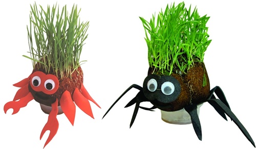 Bonequinho arrepiado: contém um vasinho e um boneco (que é feito com serragem e sementes de alpiste ou trigo e decorado com pedaços de EVA). Para fazer o cabelinho de planta crescer, a criança deve deixar o boneco submerso por 10 minutos, expor à luz e regar uma vez ao dia, até que as sementes germinem (o que leva de 5 a 7 dias). Depois é só modelar o penteado com uma tesourinha!