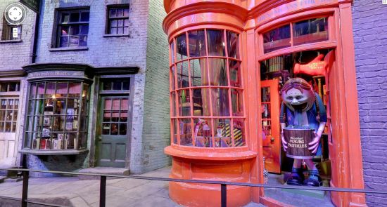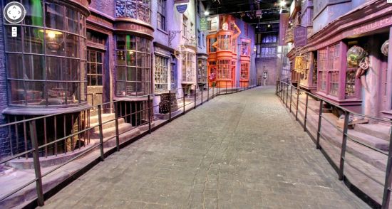 A novidade do Street View é que o Google capturou os sets de filmagem que a Warner Bros Studios fez para a série de filmes Harry Potter, mais exatamente para reproduzir uma famosa rua das histórias: o Beco Diagonal. É lá que Harry, Hermione, Rony e os outros bruxinhos compram seu material escolar: os livros de magia na Livraria Floreios e Borrões, e as famosas varinhas mágicas do Sr. Olivaras. Ah, tem também a loja Gemialidades Weasley, dos irmãos gêmeos Fred e Jorge, com produtos nada ortodoxos, como o caramelo incha-língua e o kit mata aula! Agora seu filhote pode fazer um passeio virtual pelo cenário, que fica em Hertfordshire (no Reino Unido), e não em Londres, como nos livros. As lojas do local levaram três meses para serem construídas, e foram necessários mais seis meses para a criação dos 20.000 itens que aparecem nas vitrines.