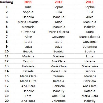 Para quem tem curiosidade em saber quais são os nomes de bebê que estão atualmente na moda, fiz uma listinha com os 20 primeiros do ranking nos últimos 3 anos. Nada parece tirar o nome Beatriz da décima posição (aconteceu em 2011, 2012 e 2013!). Entre os meninos, parece haver um rodízio de posição dos mesmos nomes (a única surpresa de 2013 foi Heitor, que não constava dos anos anteriores). Vem dar uma espiadinha: