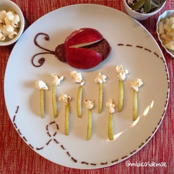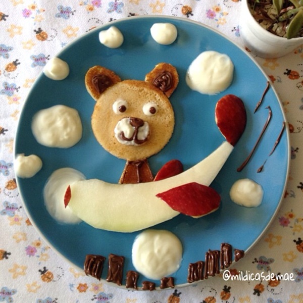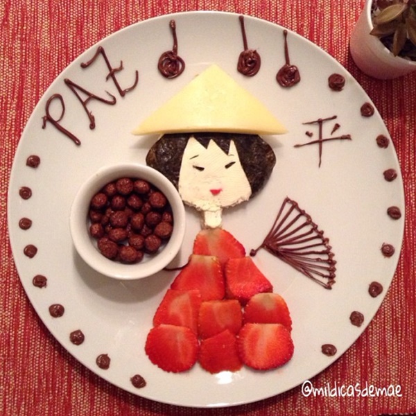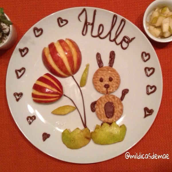 Tem uma chinesinha para o café da manhã, feita com pão, cream cheese, queijo, morangos e cereais; uma menininha tomando banho em uma sopa de macarrão; uma joaninha de maçã sobrevoando um jardim de pera e pipoca; um ursinho aviador de panqueca, em um avião de melão e um coelhinho de biscoito com flores de maçã! E para hoje à noite eu prometo um pratinho inspirado no Halloween (como estivemos fora desde a última quinta, fiquei devendo para Catarina – mas sempre é tempo de fazer a pequena feliz!).