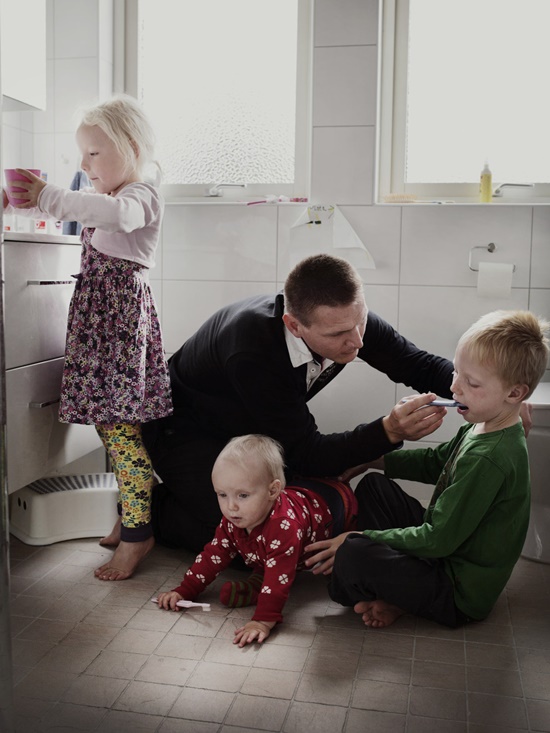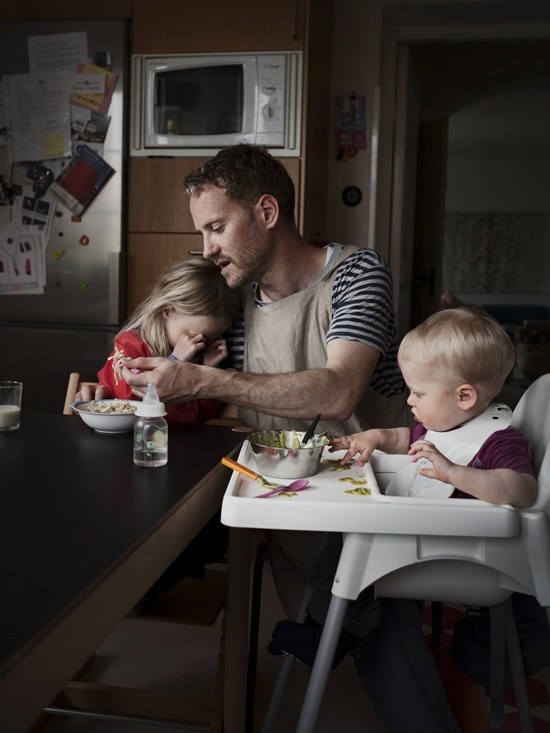Pois em outros lugares do mundo, o papel do pai na criação dos filhos é muito mais valorizado. Na Suécia, por exemplo (um dos países mais desenvolvidos do mundo, e tido como um dos melhores para se viver), a licença concedida para um casal que teve um filho é de 480 dias (sim, mais do que um ano!), sendo que cada um dos pais é obrigado a tirar pelo menos 60 dias – o restante do tempo é dividido como marido e esposa decidirem. Embora apenas 12% dos pais suecos dividam esse período de forma igualitária com as mães, a participação do pai nos cuidados com as crianças é muito maior do que ocorre em nosso país – há, inclusive, aqueles que decidem ficar um ano inteiro em casa! E foi registrando o dia-a-dia desses pais que assumiram a função de permanecer meses em casa, que o fotógrafo Johan Bävman criou um projeto muito especial: o “Swedish Dads” (Pais Suecos). Aliás, ele teve a ideia na fase em que ficou cuidando de seu filho recém-nascido.
