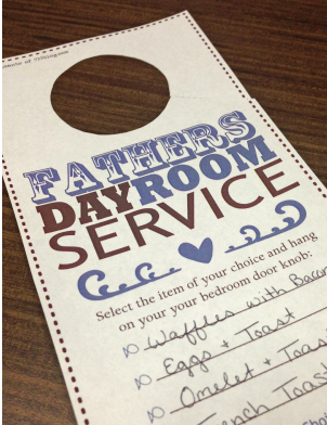 Quem não gosta de um café da manhã na cama? Com direito a ter os filhotes fazendo a maior farra junto? Nesse link aqui você pode baixar um papelzinho de serviço de quarto (que está em inglês, mas quebra o galho!), para o papai escolher o que quer receber no quarto pela manhã (acompanhado do beijo dos pequenos, claro!).