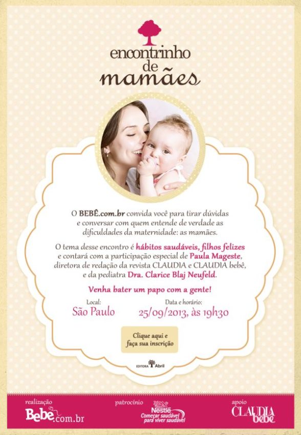 Sabe o que vai rolar amanhã, dia 25 de setembro, às 19:30h, na Editora Abril? O próximo Encontrinho de Mamães do portal Bebe.com.br! Para quem nunca foi, vale a pena dar uma espiadinha nesse post aqui, onde eu conto como foi o último. O que eu posso dizer é que a experiência vale a pena, pois é um momento de conhecer outras mães, conversar em um clima gostoso (o pessoal do Bebe é muito legal e consegue tornar os eventos super aconchegantes!), trocar informações e ainda bater um papo com especialistas. Neste que acontecerá essa semana, estarão a diretora de redação da Revista Claudia e Claudia Bebê, Paula Mageste, e a pediatra Clarice Blaj Neufeld, que conversarão sobre o tema “Hábitos saudáveis, filhos felizes”.