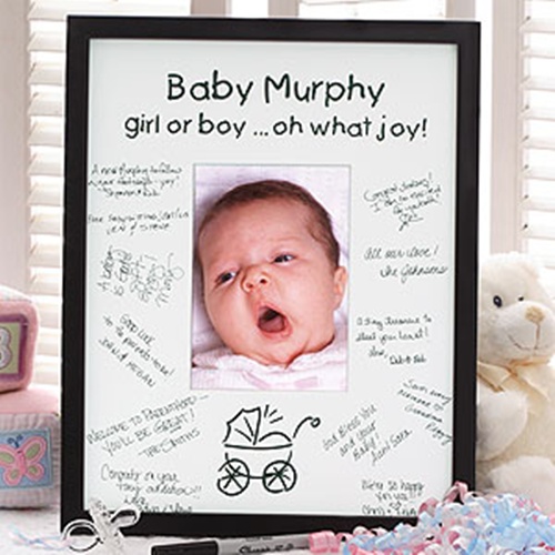 Mensagens: no chá de bebê, peça para que os amigos e a família deixem mensagens para o bebê que está chegando, em uma moldura. Depois do nascimento, é só enquadrar uma foto do bebê!